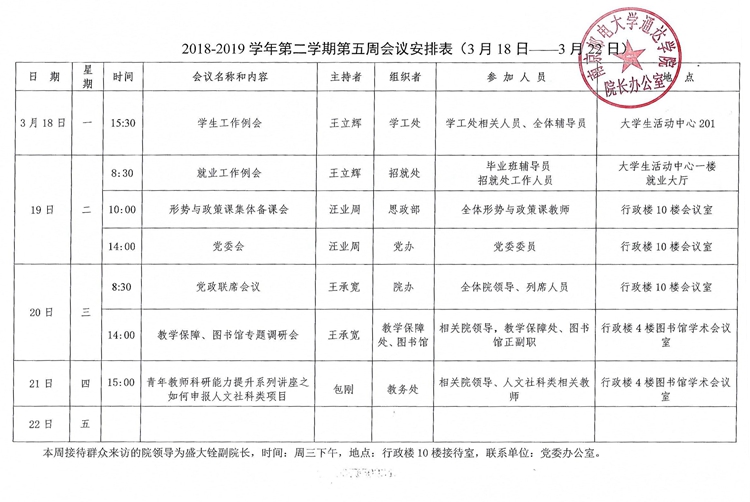2018-2019学年第二学期第五周会议安排表