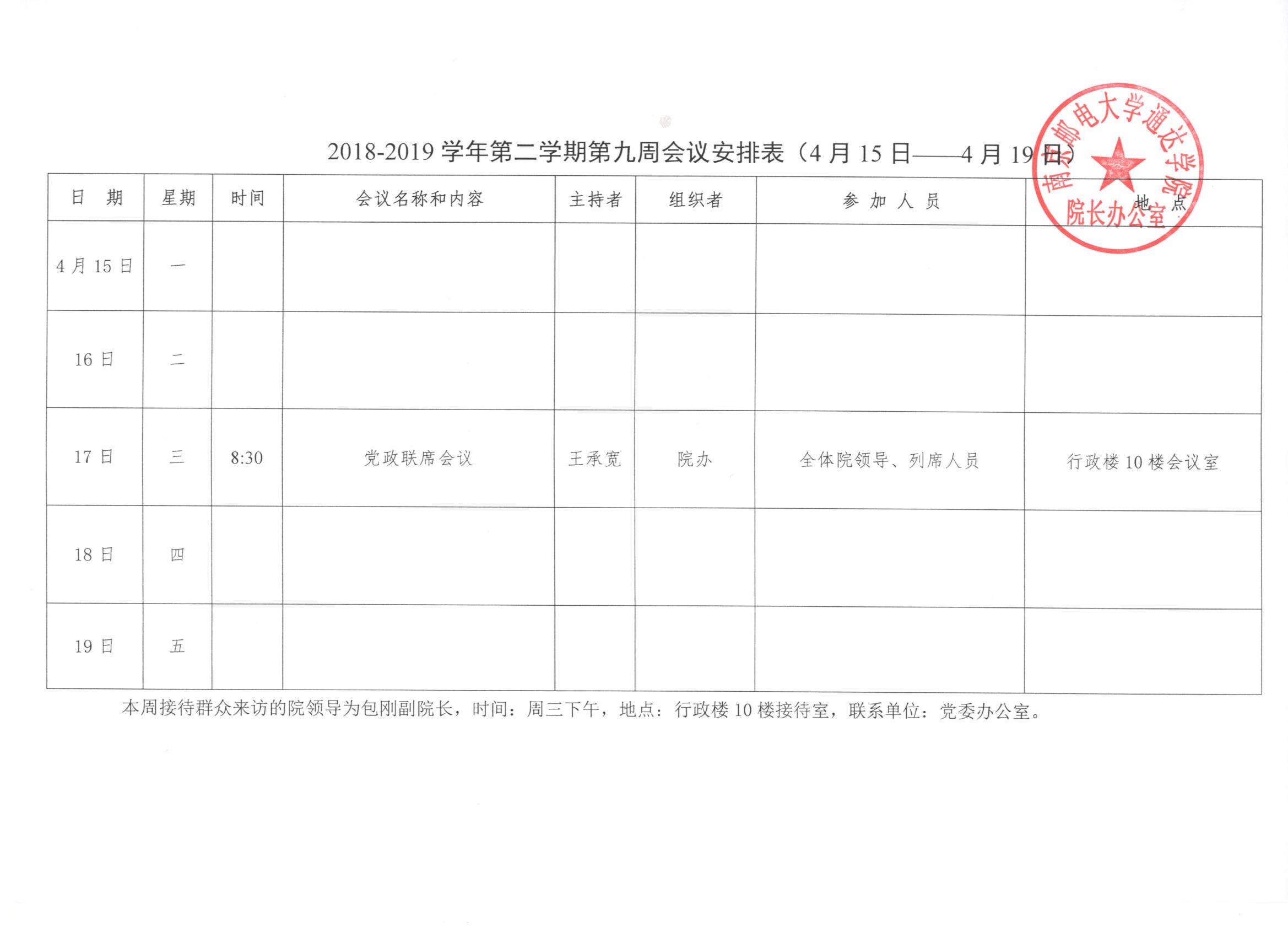 2018-2019学年第二学期第九周会议安排表