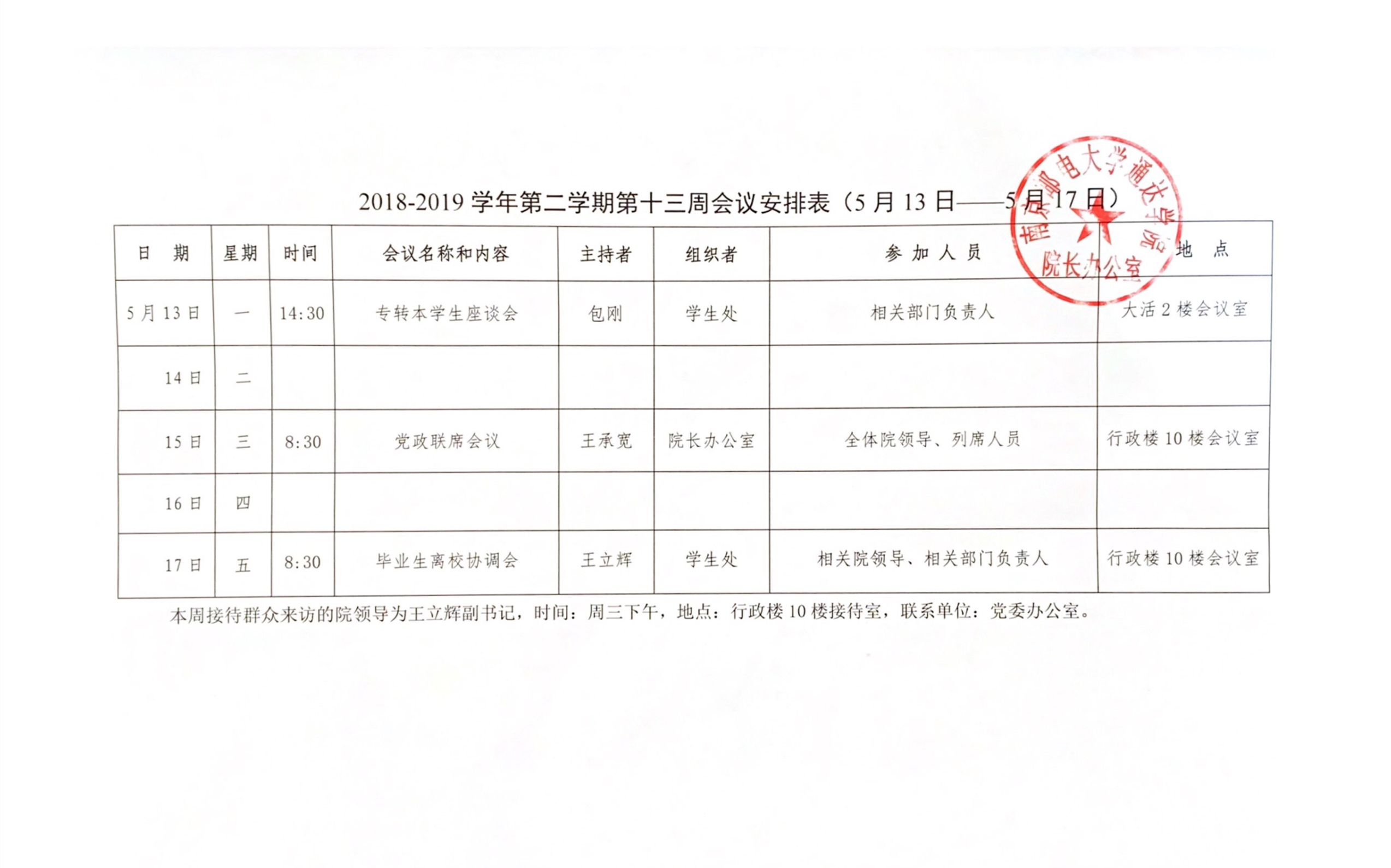 2018-2019学年第二学期第十三周会议安排表