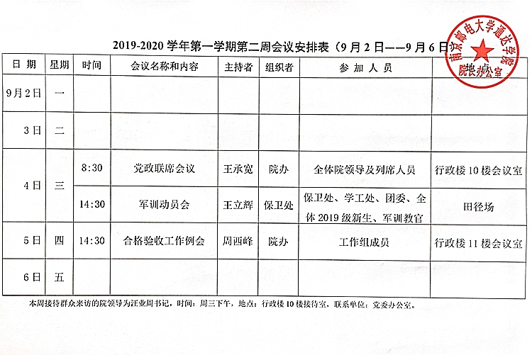 2019-2020学年第一学期第二周会议安排表