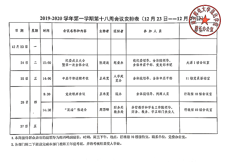 2019-2020学年第一学期第十八周会议安排表
