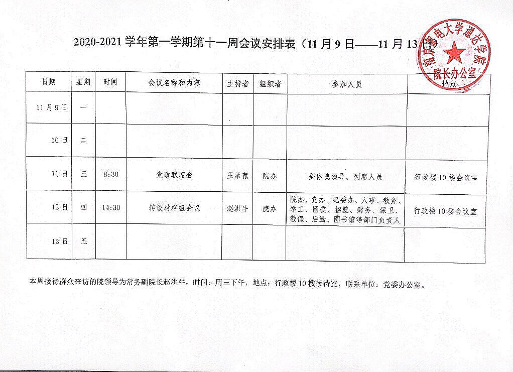 2020-2021学年第一学期第十一周会议安排表
