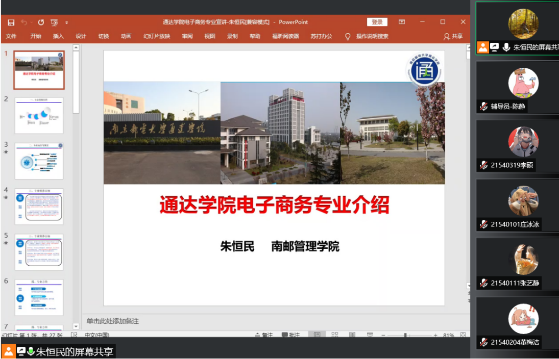 解读会上,7位老师分别对本专业的培养目标、毕业要求、主干学科与交叉学科、核心课程、毕业学分及比例要求、主要课程与毕业要求的对应矩阵关系以及课程体系配置流程图等方面内容予以详细介绍。并针对学生关心的考研和就业选择问题,老师们结合往届学生案例以及本专业特点,为新生们提出建议。解读结束后,老师与新生们在线开展互动交流,同学们提出了关于考研专业及学校选择、资格证书考取、就业方向、专业课学习等方面的问题,老师们均给予一一解答。