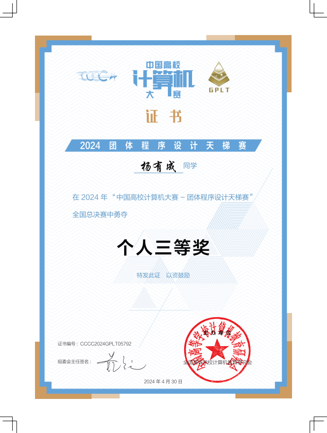 近日,由全国高等院校计算机教育研究会主办的“第九届中国高校计算机大赛-团体程序设计天梯赛”获奖名单正式公布,开元两支代表队在3小时的比赛中,争分夺秒,团队协作,顽强拼搏,喜获全国总决赛团队三等奖、江苏省团队二等奖各1项,其中陈天意获全国个人一等奖、杨有成获全国个人三等奖,创造了学院在该项赛事的新纪录。