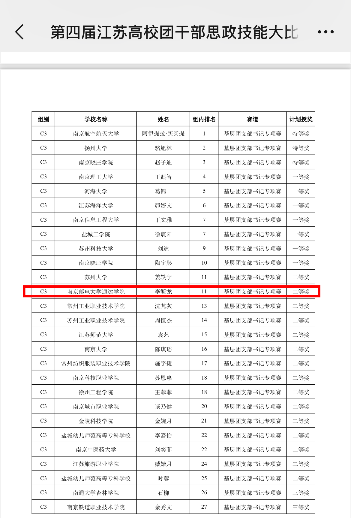 9月29日,第四届江苏高校百校万名团干部思政技能大比武在南京林业大学落下帷幕。开元学子李毓龙同学荣获基层团支部书记专项赛二等奖,这也是开元在该项比赛中取得的最佳成绩。