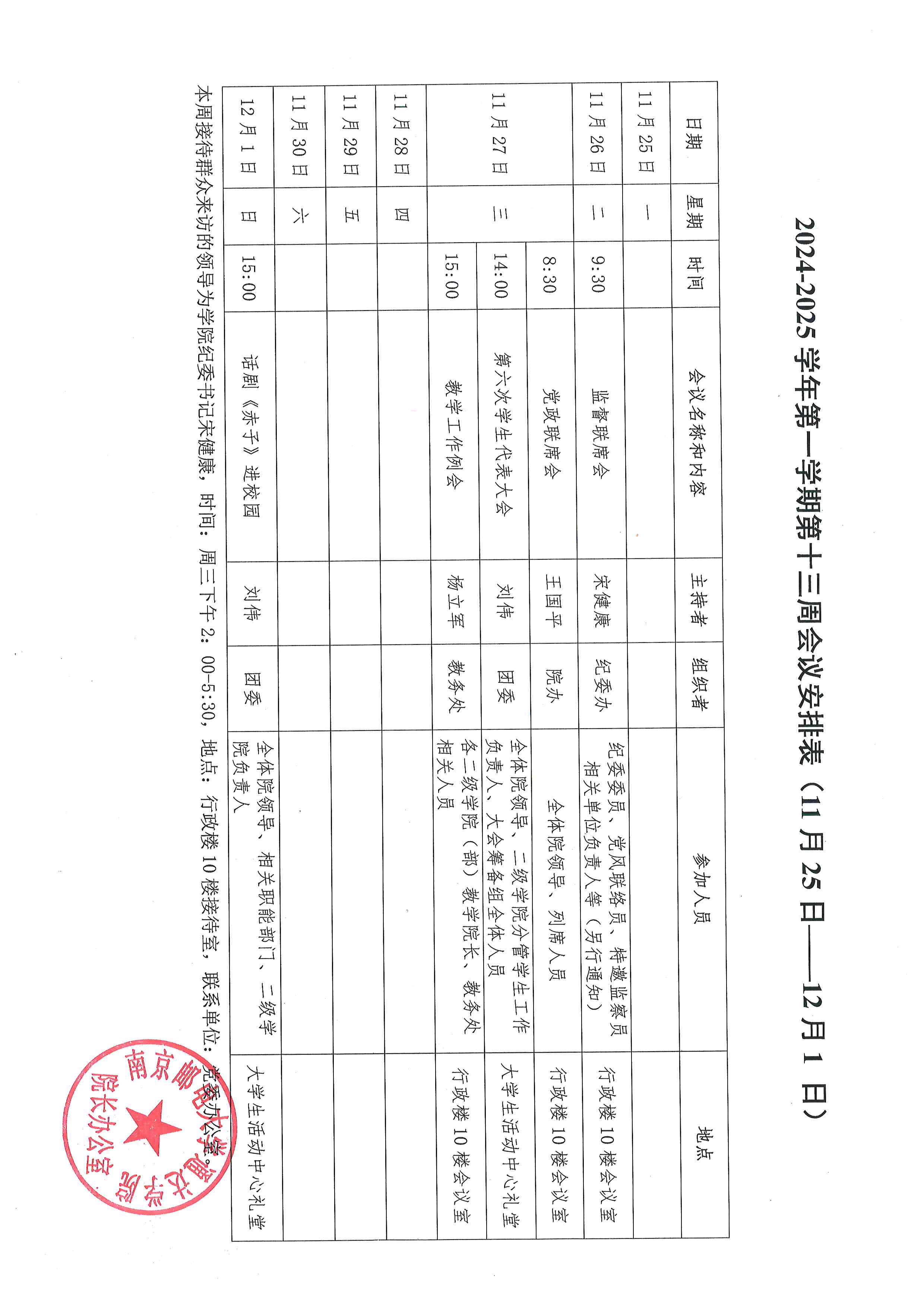 2024-2025学年第一学期第十三周会议安排表