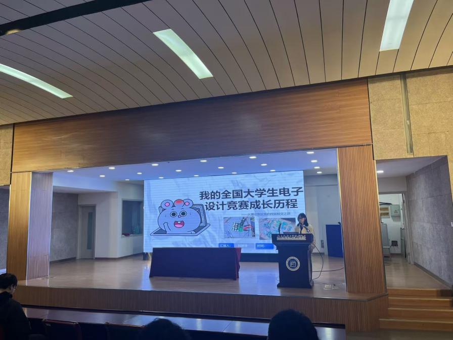 最后,2025年全国大学生电子设计竞赛国家二等奖获得者脱碧莲同学以“我的竞赛成长之路”为题,分享了备赛过程中的心路历程。她总结道:“从最初的电路设计失误到最终作品稳定运行,我们经历了无数次调试与修改。坚持与反思是成功的关键,每次失败都是学习的机会,团队要善于总结经验,调整策略。”